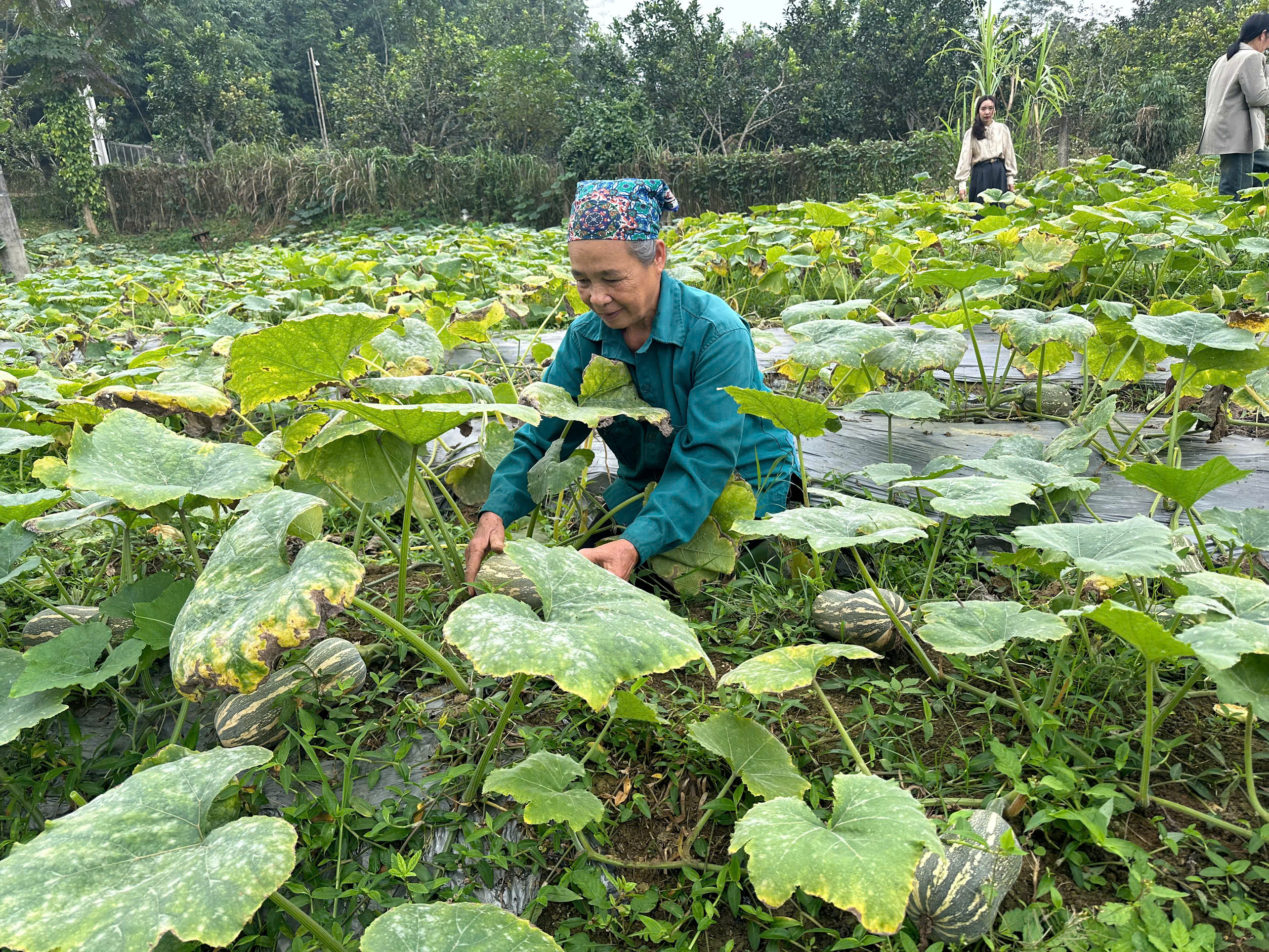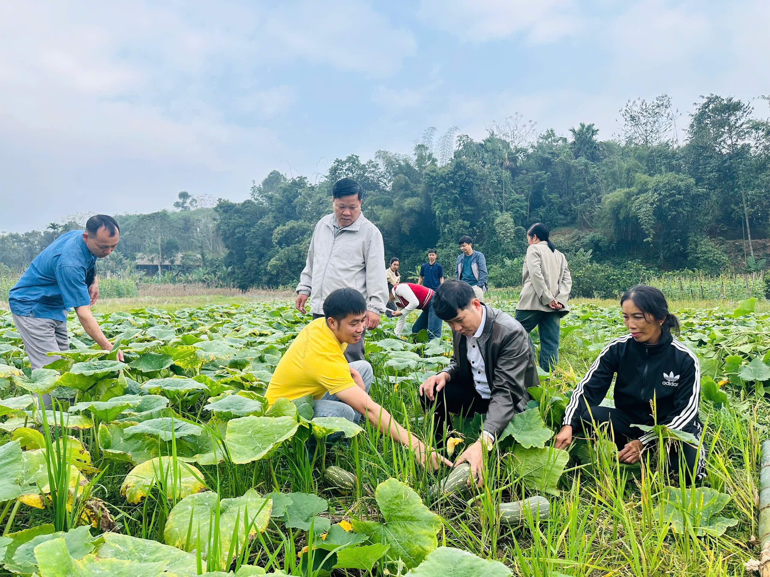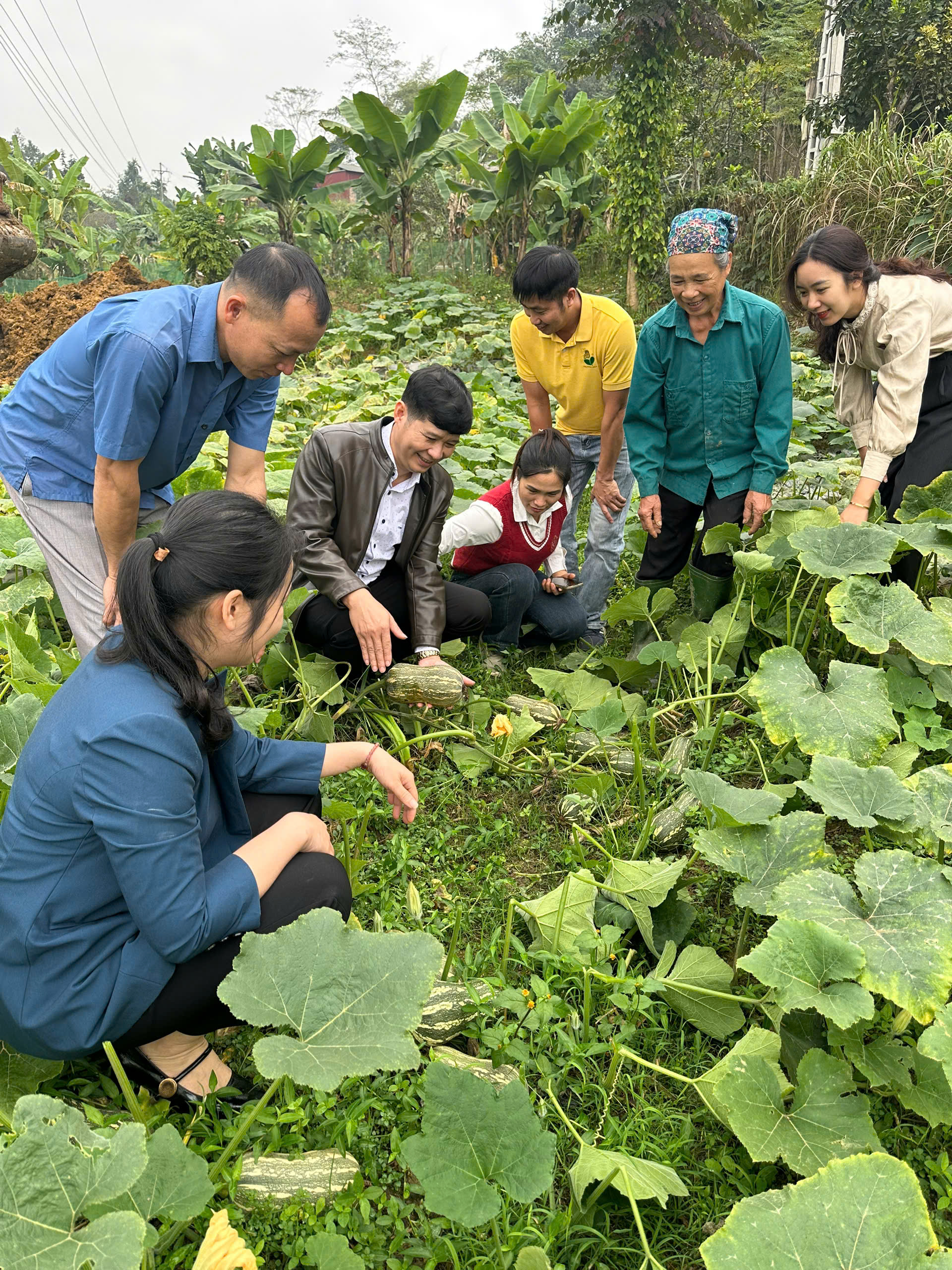 Các đồng chí lãnh đạo xã, HTX Tân Hòa, Công ty Hạt giống Đồng tiền vàng tham qua mô hình trồng bí đỏ của các hộ dân trên địa bàn xã Hòa An