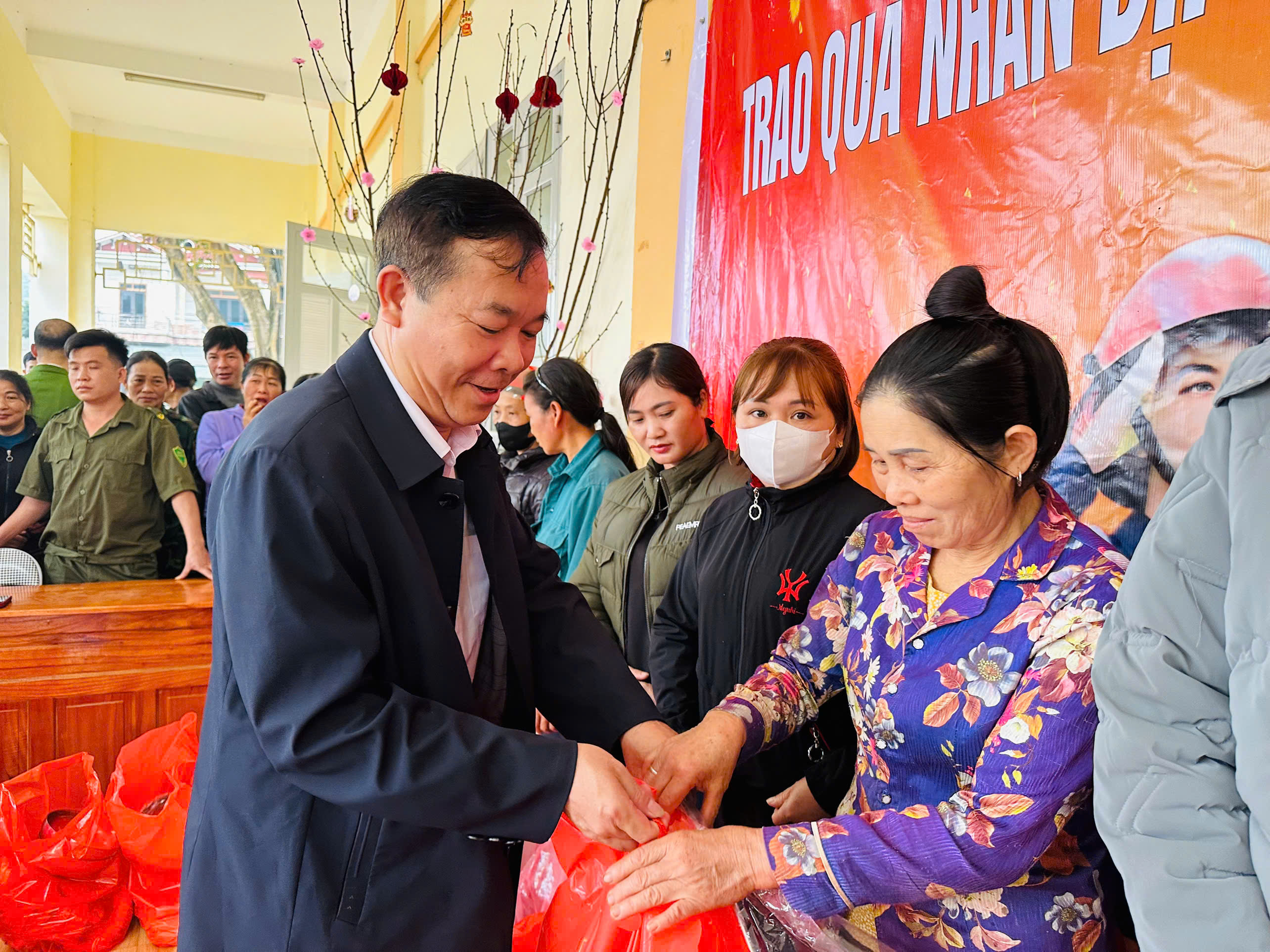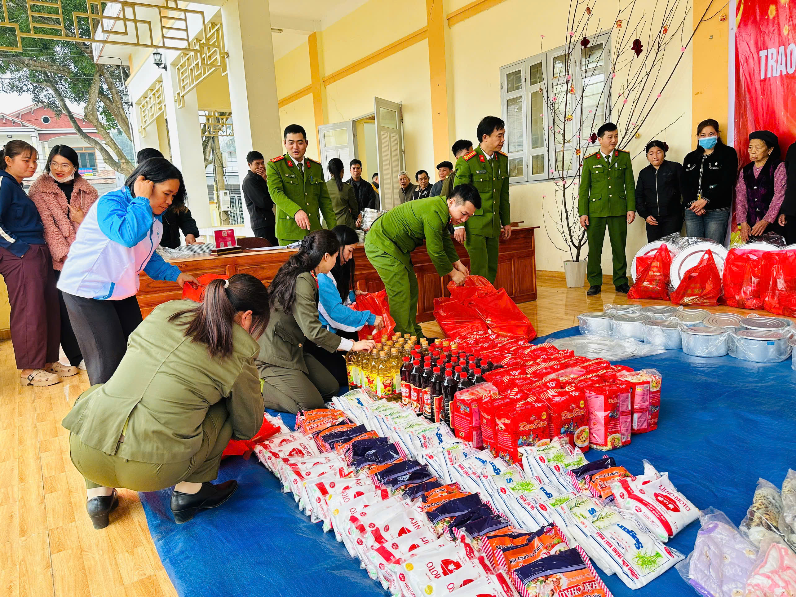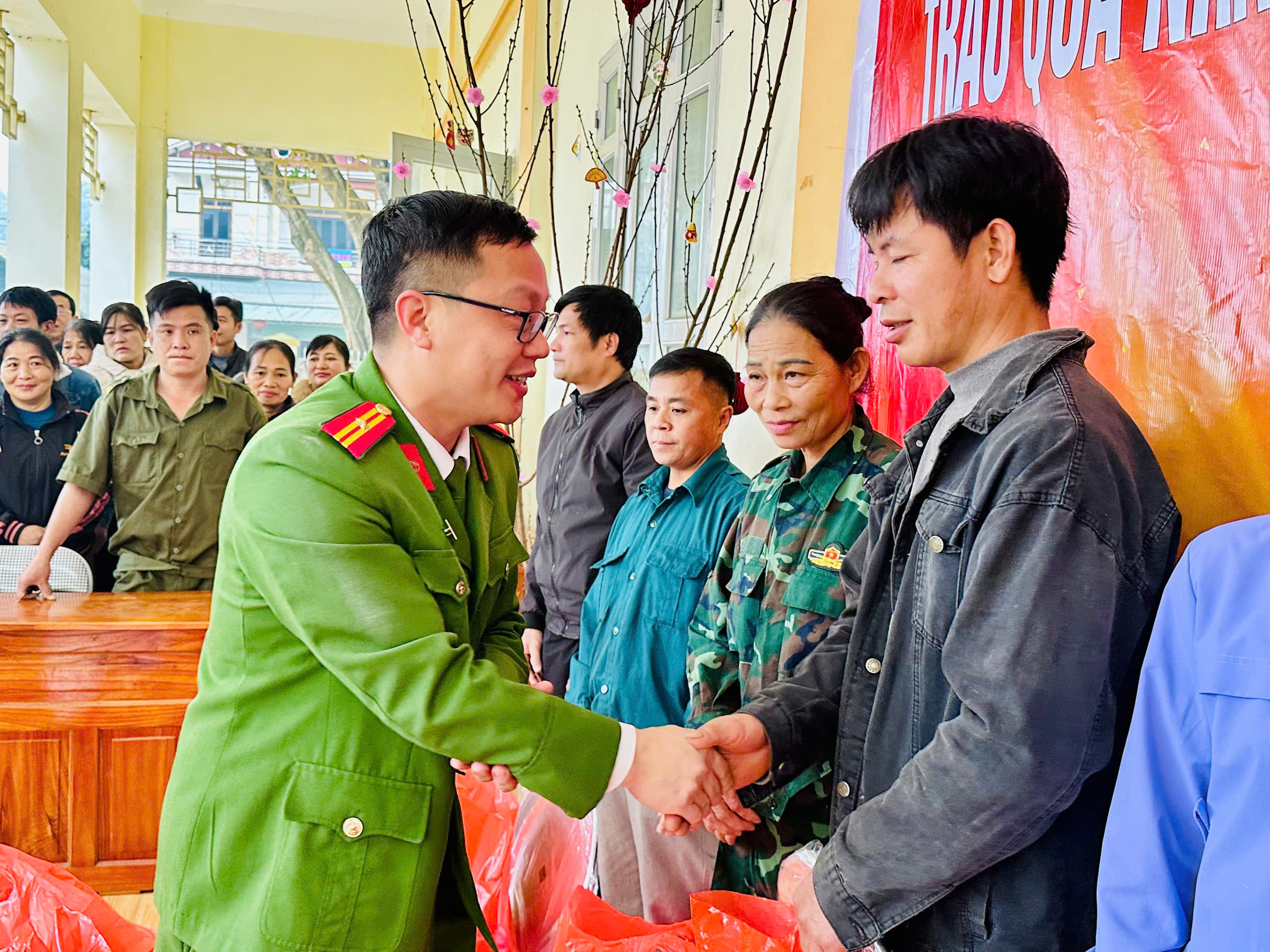 Các đồng chí lãnh đạo xã, Công an xã tặng quà cho các hộ gia đình