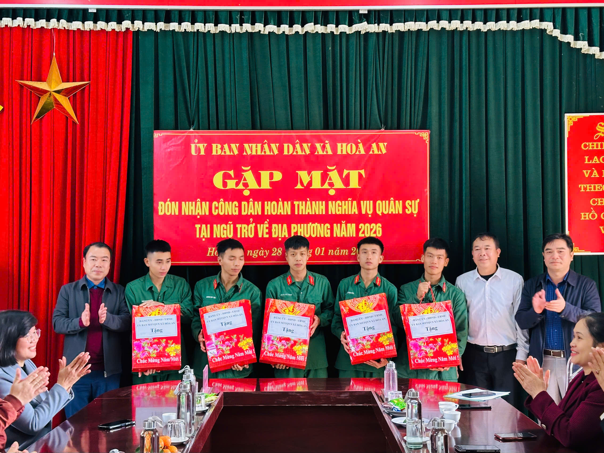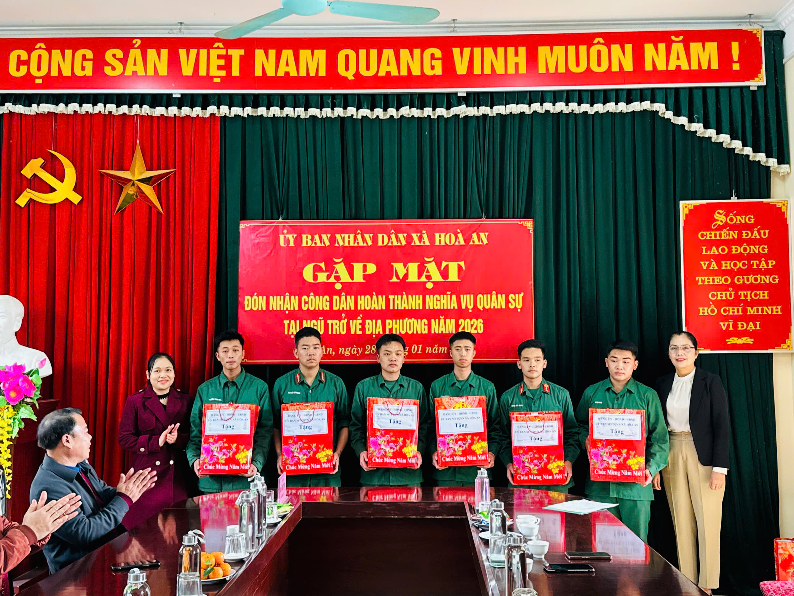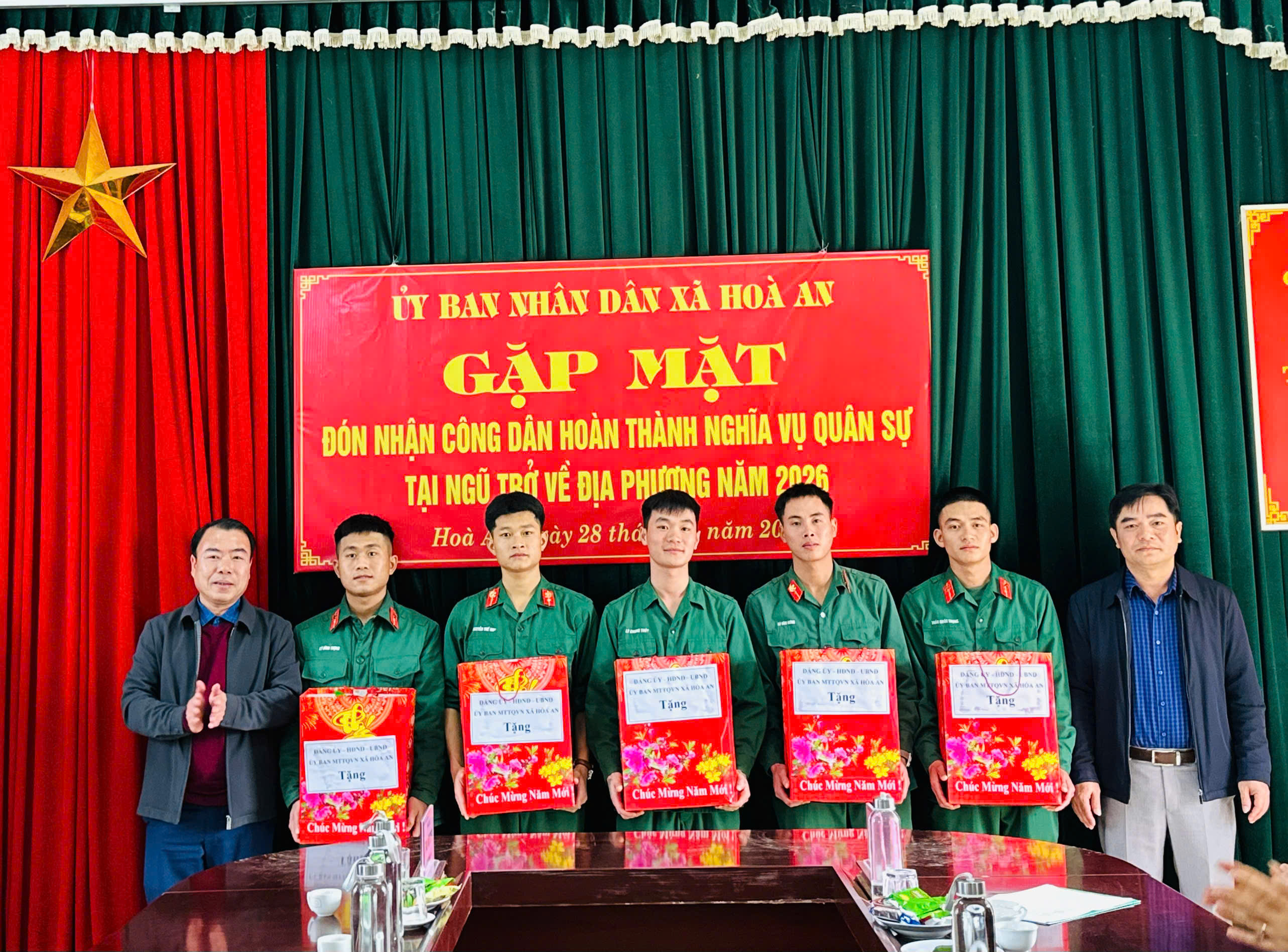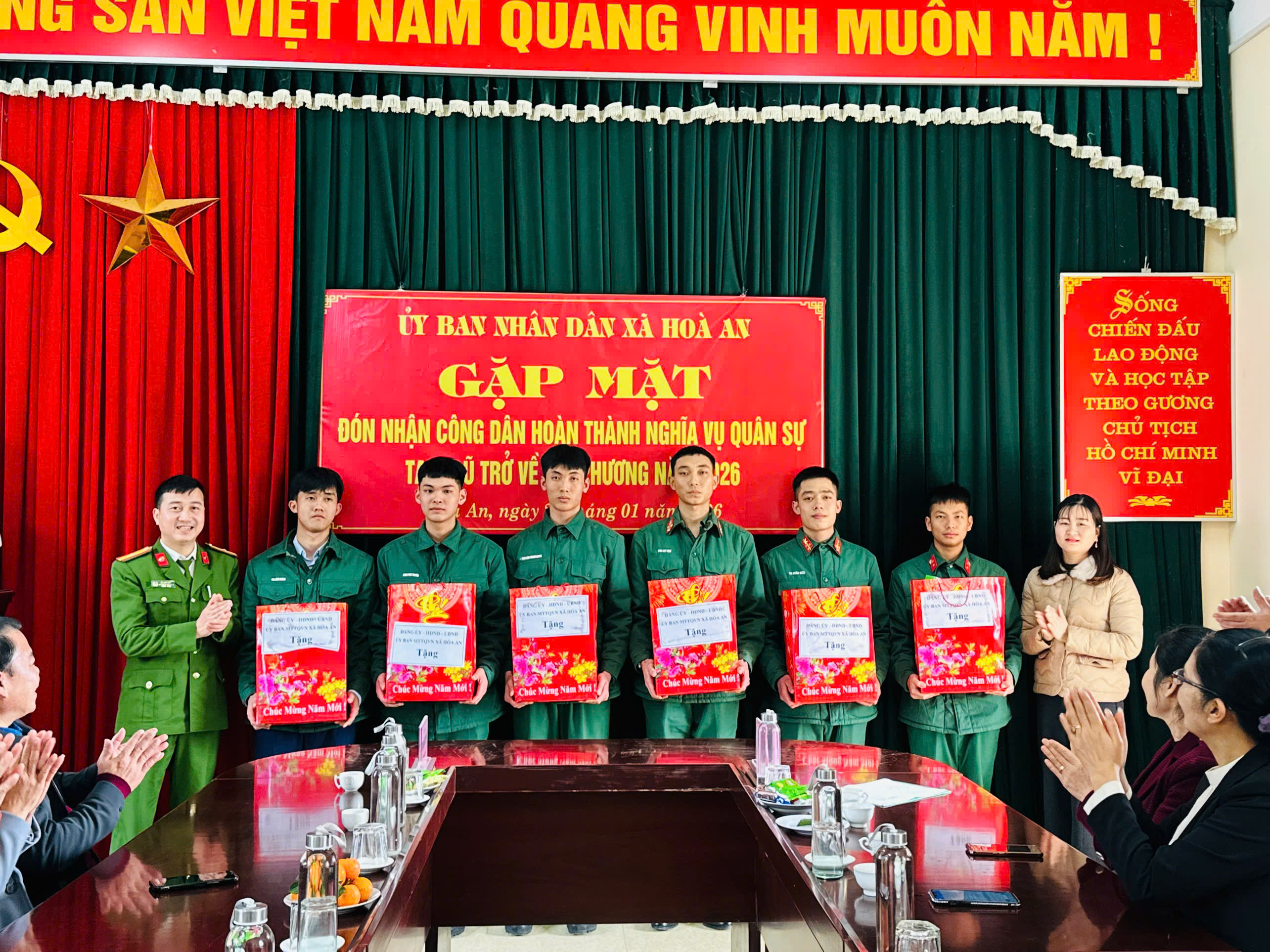 Các đồng chí lãnh đạo xã cũng đã tặng quà chúc mừng các quân nhân đã hoàn thành tốt nhiệm vụ được giao