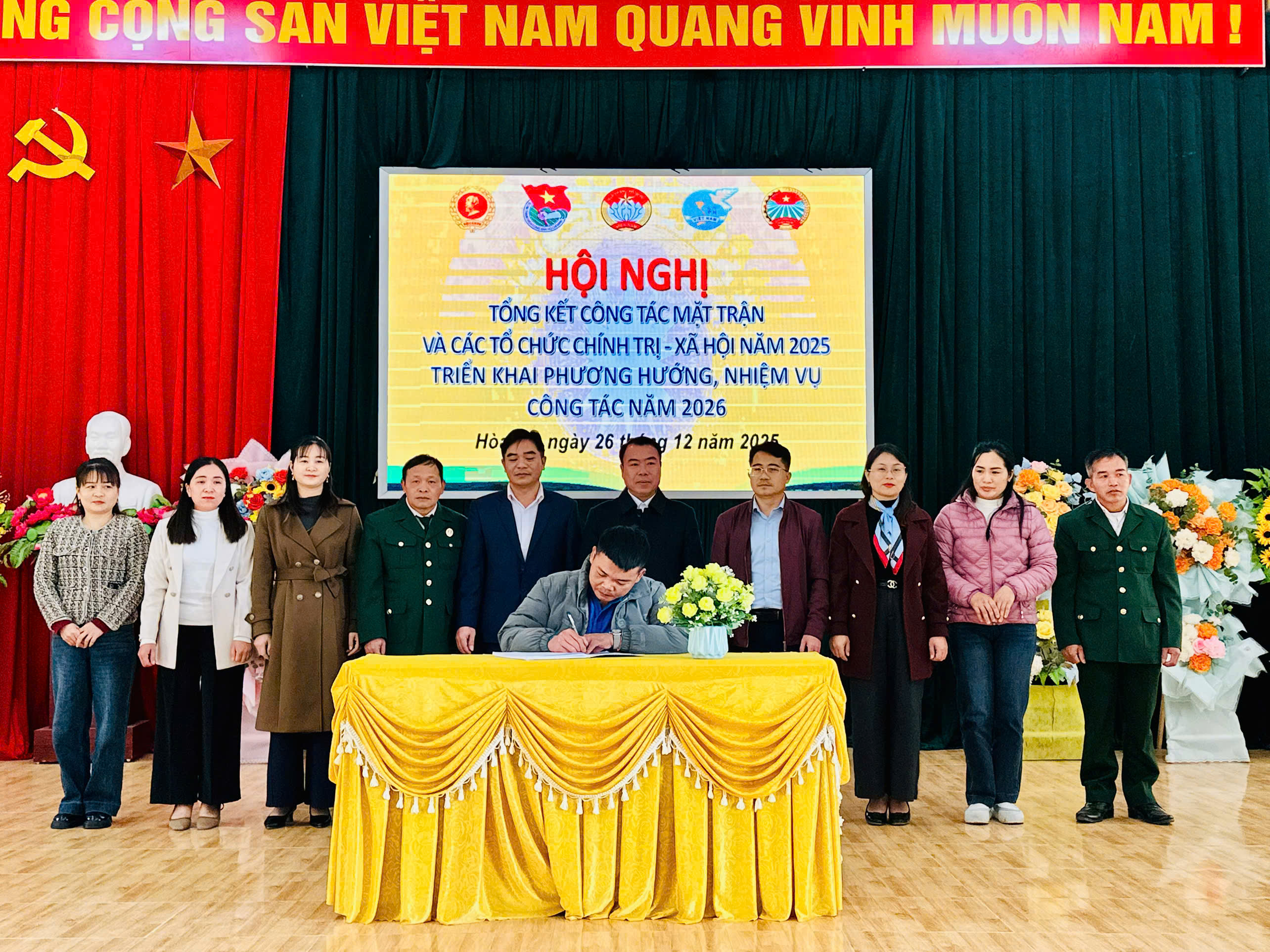 Tại hội nghị lãnh đạo Ủy ban MTTQ xã phát động thi đua; đại diện Ban công tác mặt trận, các tổ chức đoàn thể thôn ký giao ước thi đua năm 2026.
