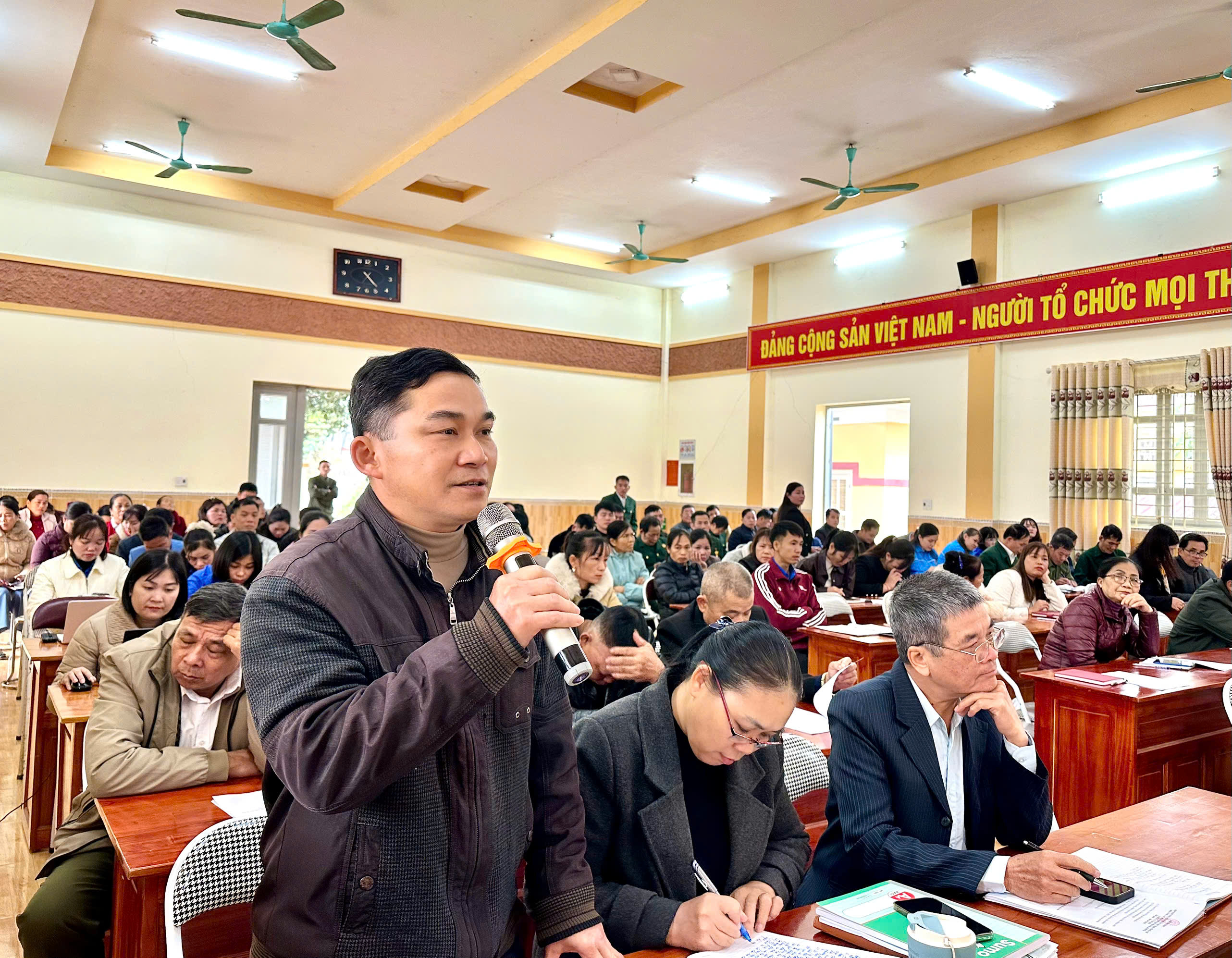 Đồng chí Trần Văn Tuyên, Bí thư Đảng ủy xã phát biểu tại Hội nghị
