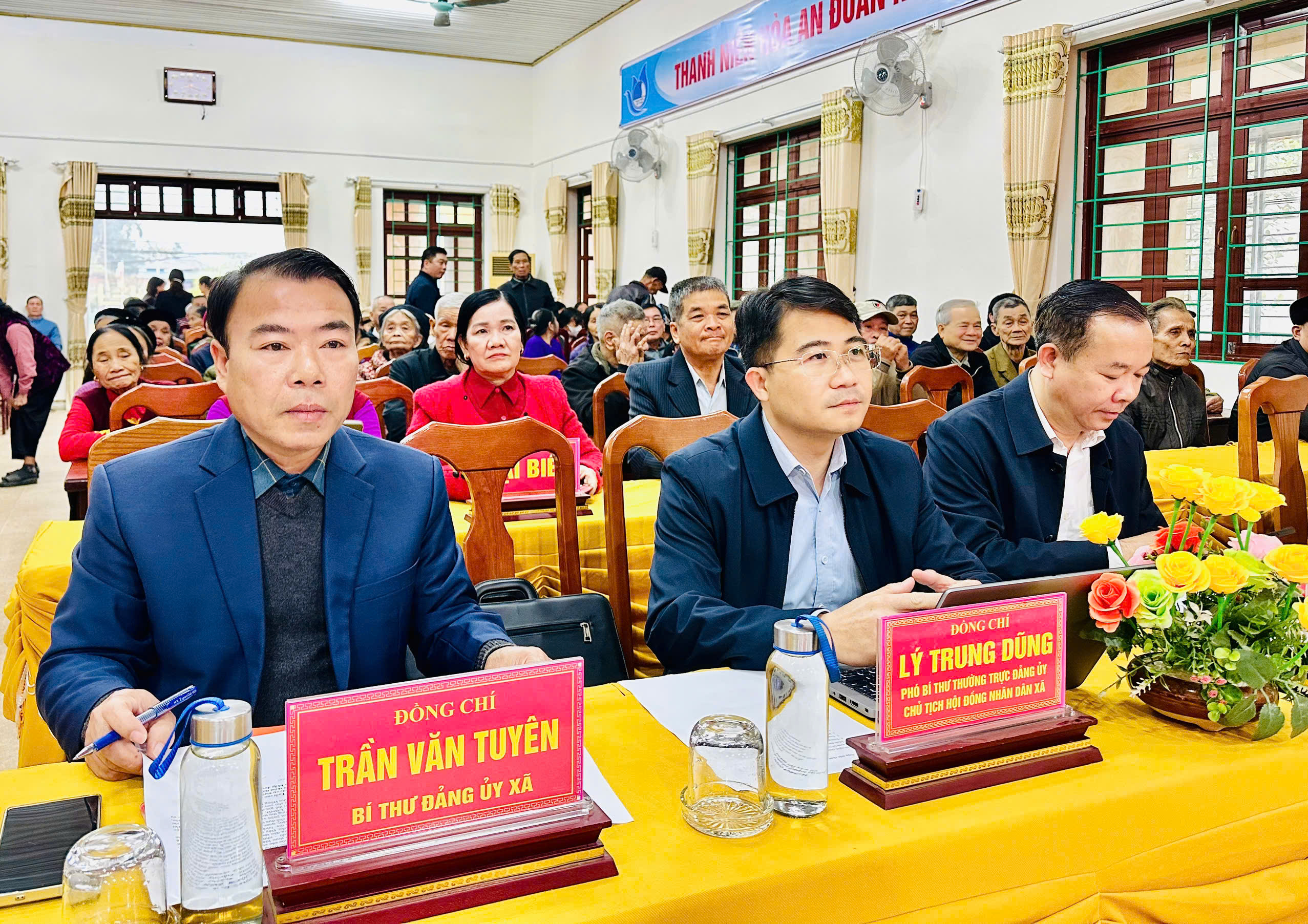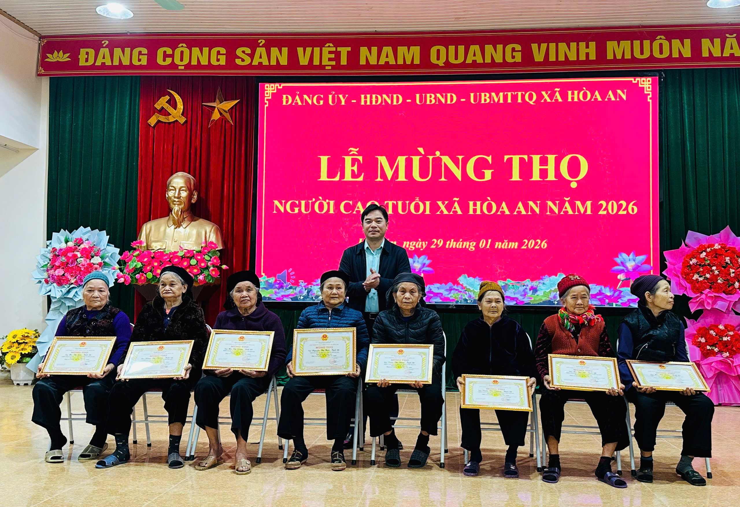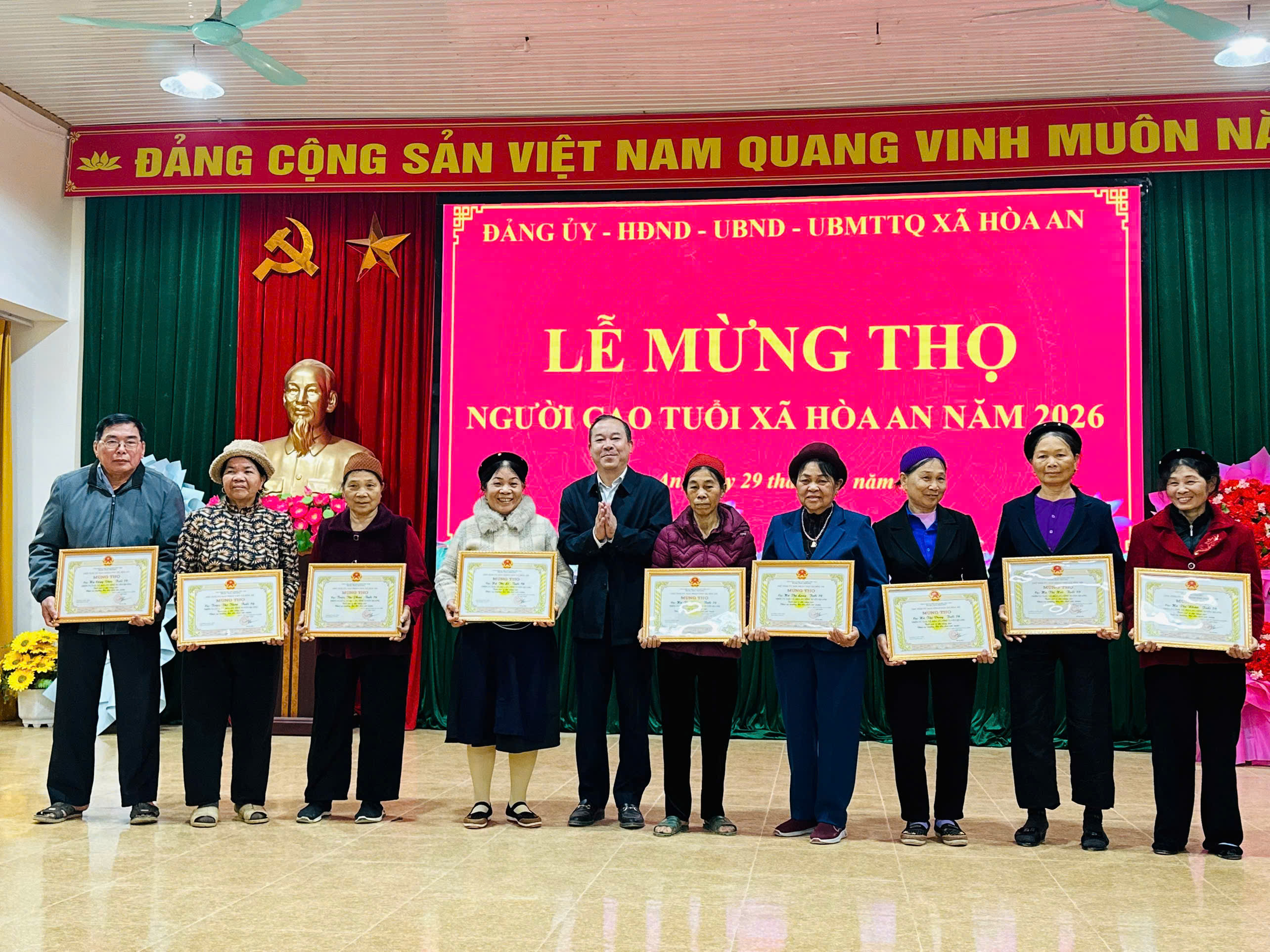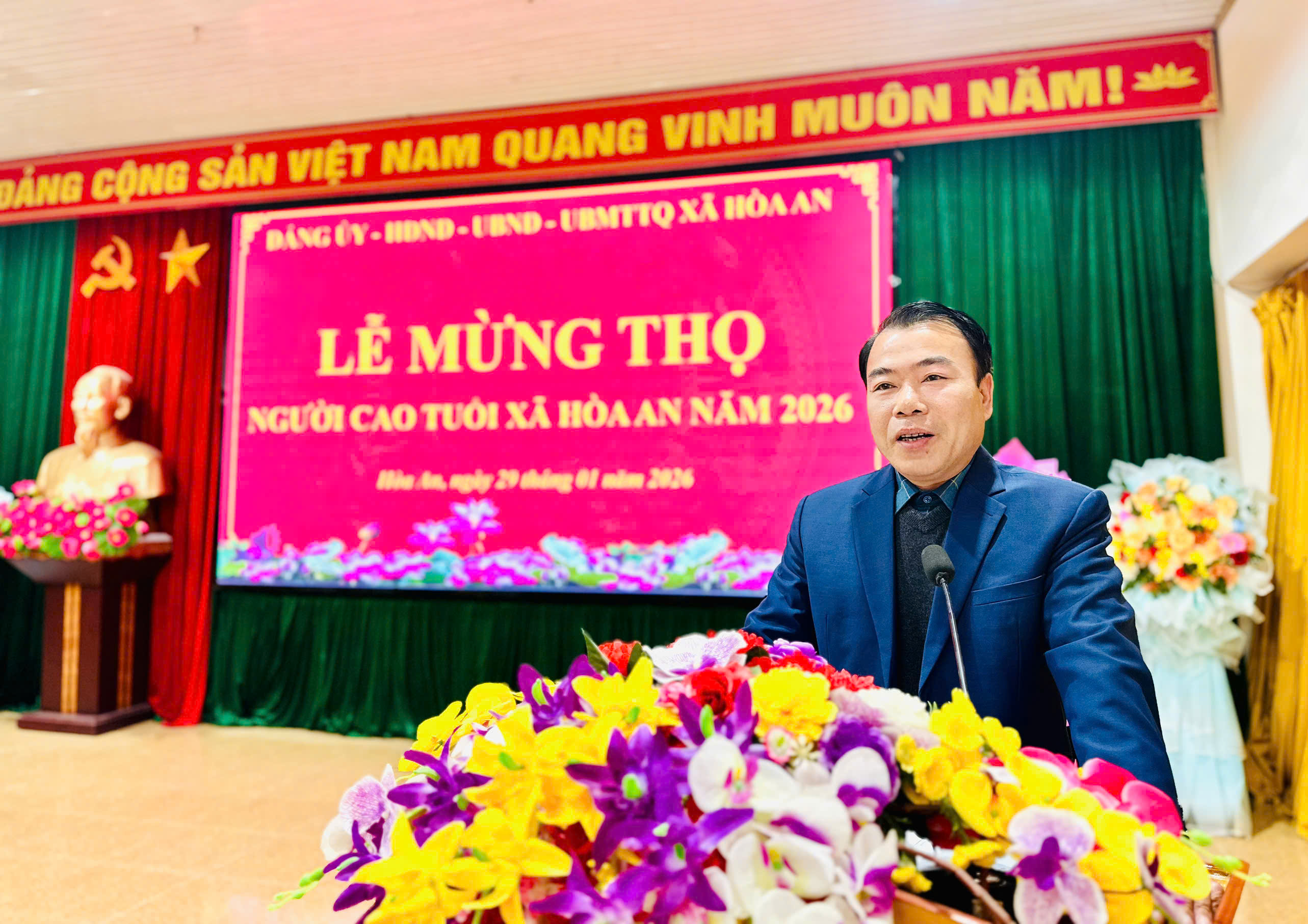 Phát biểu tại buổi Lễ chúc thọ đồng chí Trần Văn Tuyên, Bí thư Đảng ủy xã nhấn mạnh: Cấp uỷ, chính quyền địa phương luôn ghi nhận và đánh giá cao đóng góp to lớn các cụ trong thời gian qua để xây dựng xã Hòa An ngày càng phát triển, đồng thời mong muốn các cụ tiếp tục sống vui, sống khoẻ, sống hạnh phúc, tiếp tục vận động con cháu tích cực phát triển kinh tế, thực hiện tốt chủ trương chính sách của Đảng, Pháp luật của nhà nước, tham gia các hoạt động xã hội góp phần xây dựng xã nhà phát triển bền vững trong thời gian tới.