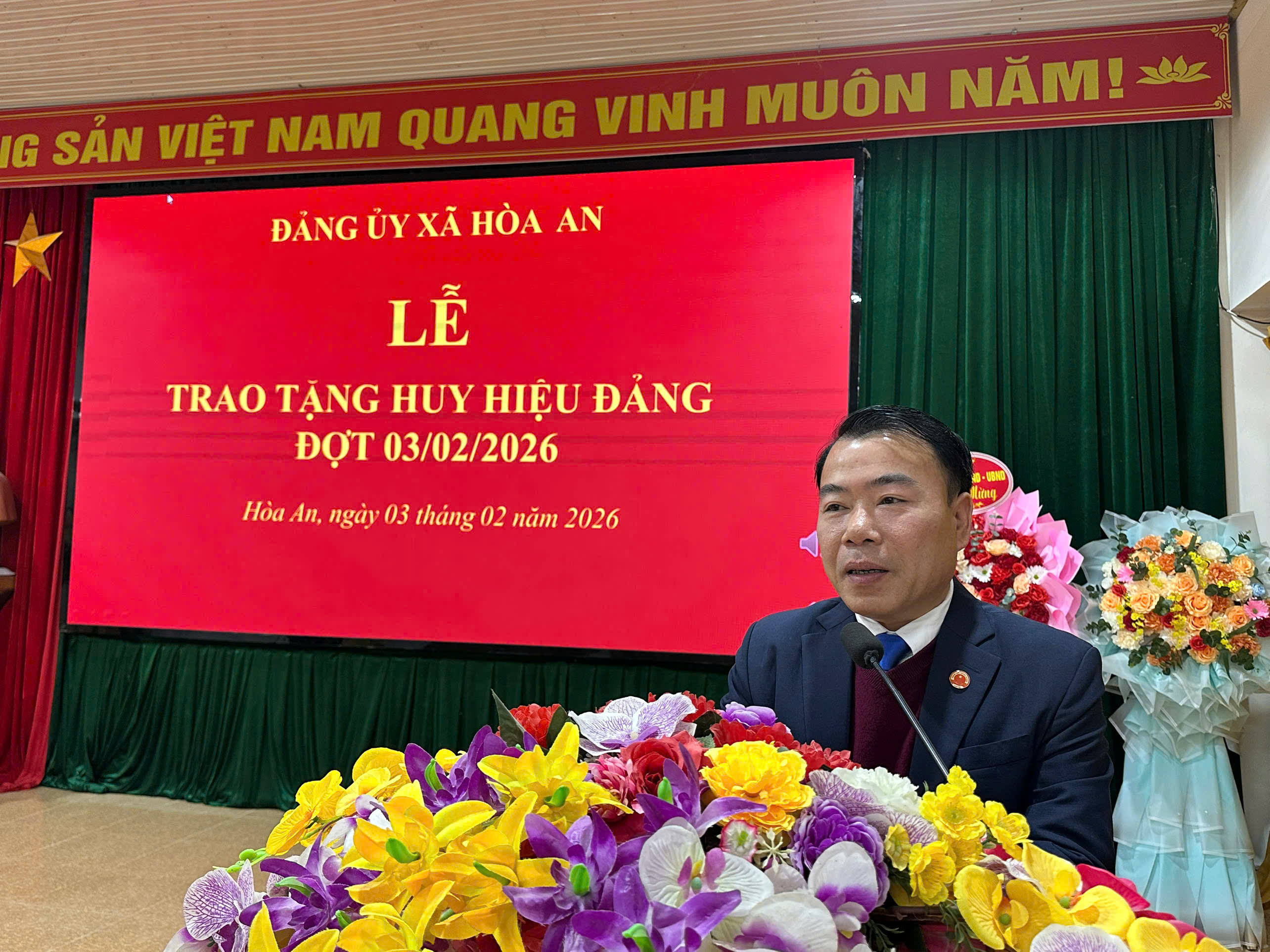 Đồng chí Trần Văn Tuyên, Bí thư Đảng ủy xã phát biểu tại Lễ trao tặng Huy hiệu đảng đợt 3/2/2026
