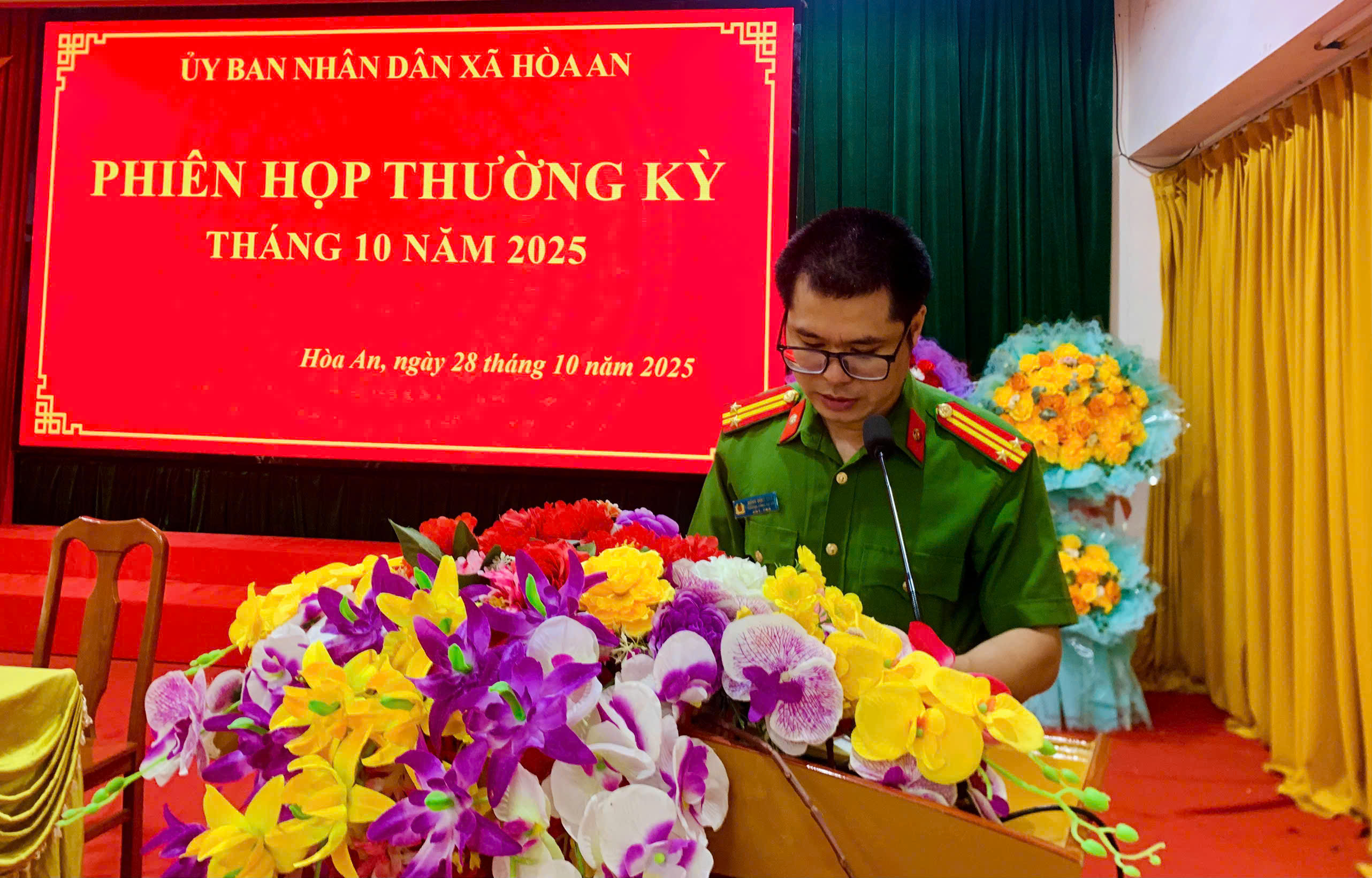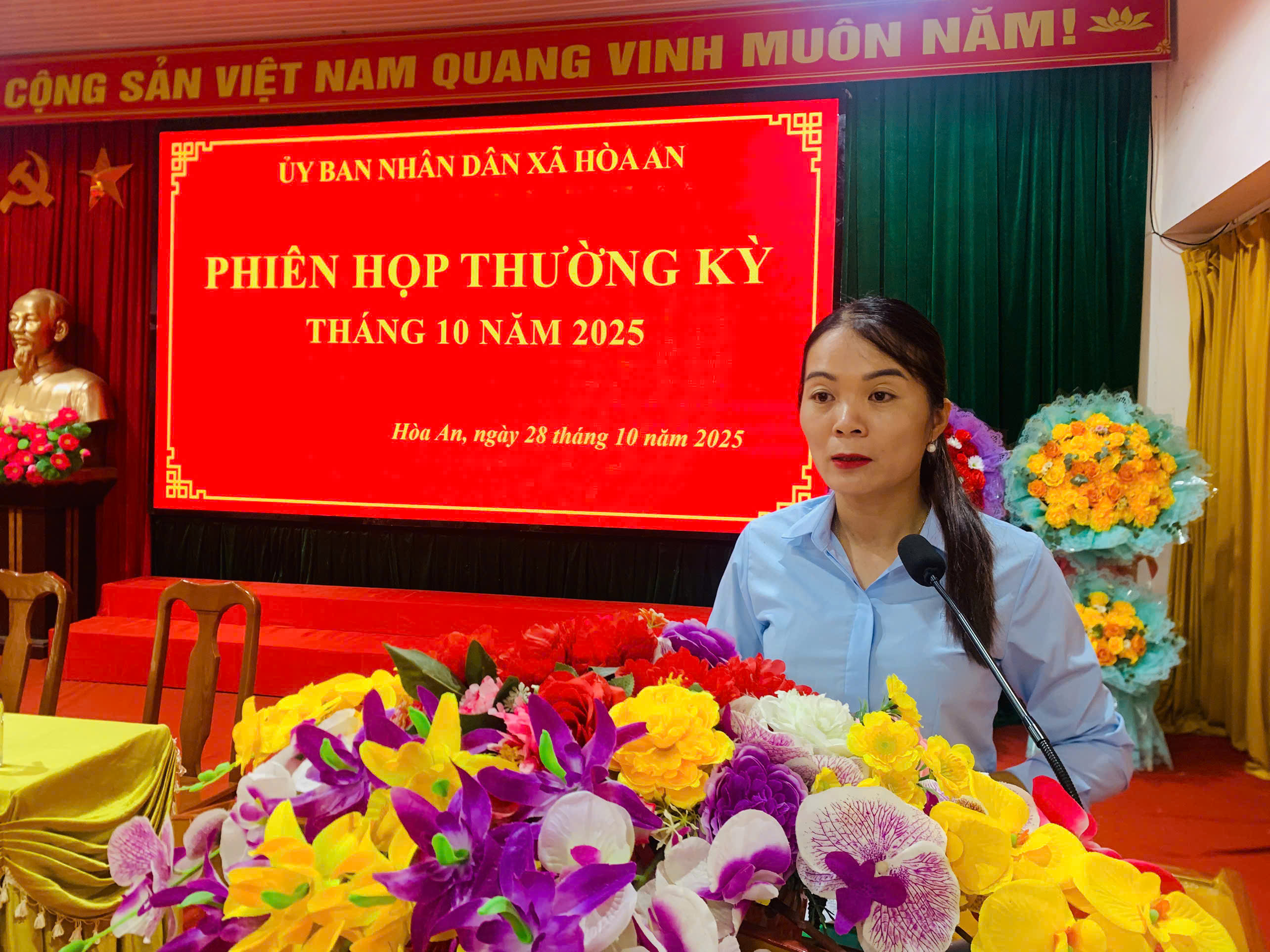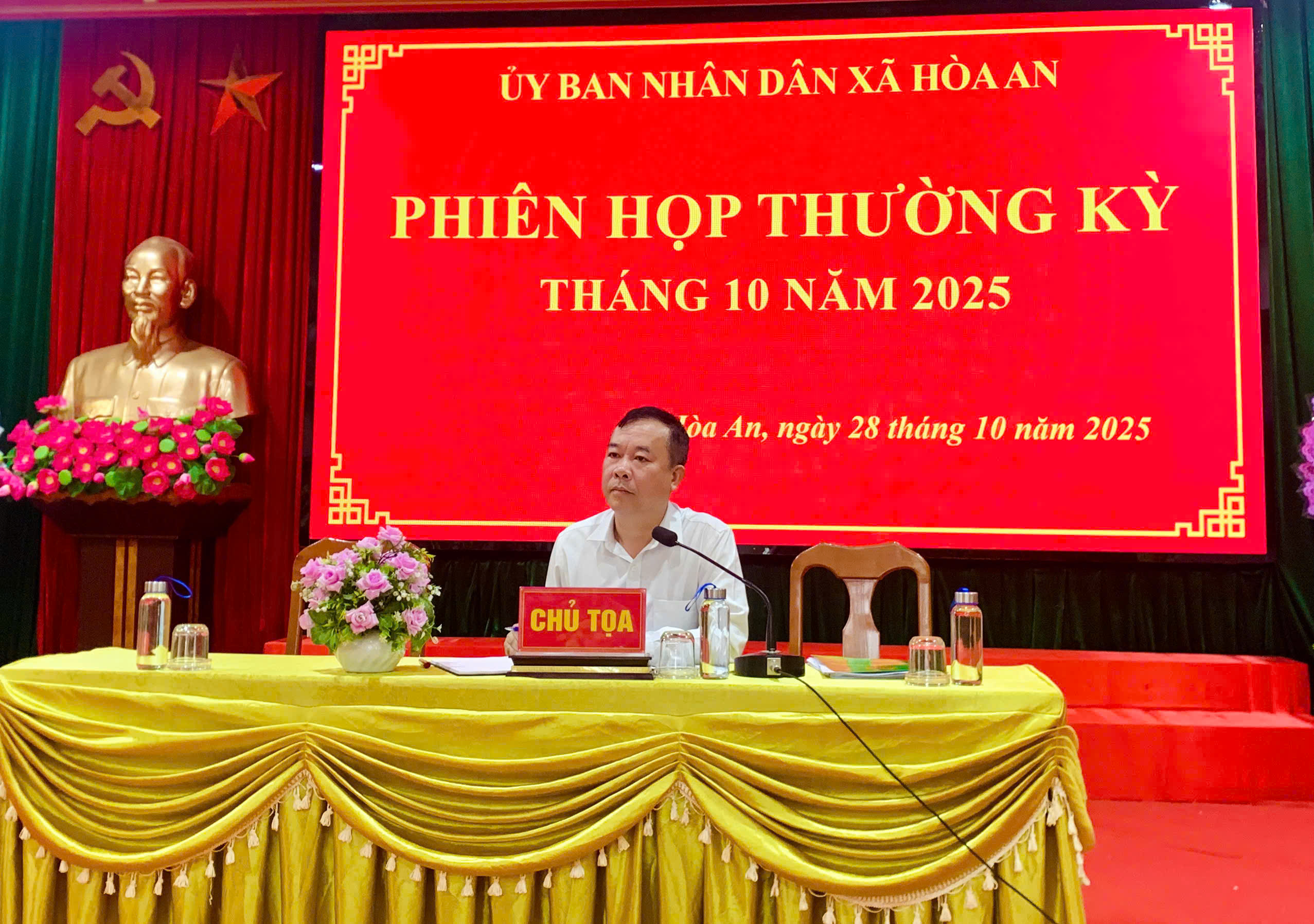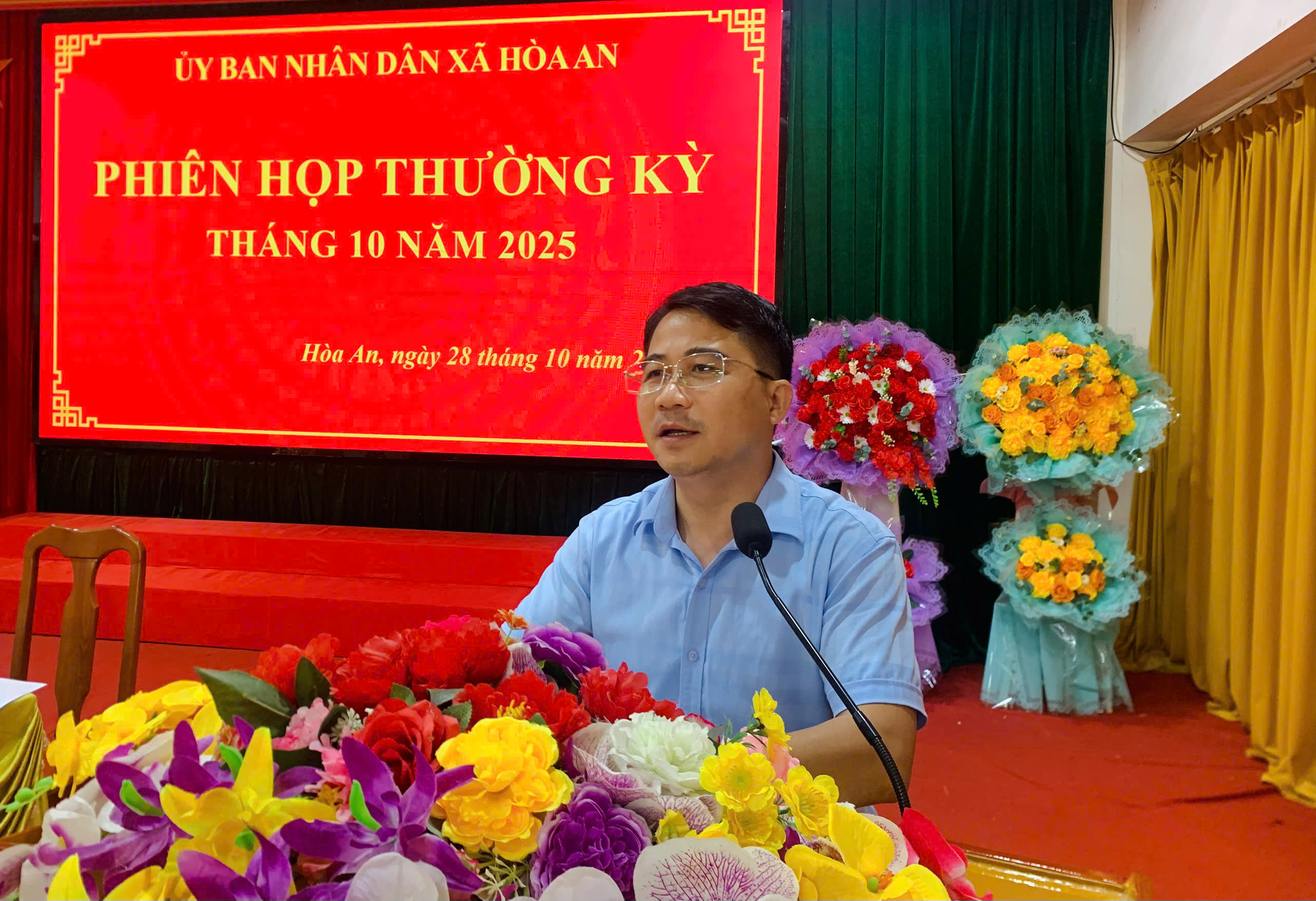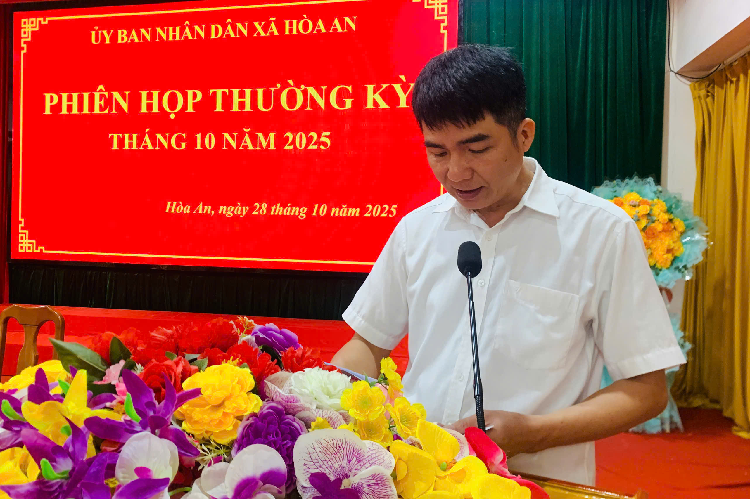 Phiên họp đã thông qua các nội dung: Dự thảo báo cáo kết quả thực hiện nhiệm vụ phát triển kinh tế - xã hội, bảo đảm quốc phòng, an ninh, công tác xây dựng chính quyền tháng 10; nhiệm vụ công tác tháng 11/2025. Báo cáo tiến độ, kết quả thực hiện bê tông hóa đường giao thông năm 2025; tiến độ thực hiện Kế hoạch rà soát hộ nghèo, hộ cận nghèo, hộ làm nông nghiệp, lâm nghiệp, ngư nghiệp có mức sống trung bình cuối năm 2025 trên địa bàn xã; tiến độ, kết quả thực hiện Kế hoạch số 44/KH-UBND ngày 24/9/2025 của Ủy ban nhân dân xã về thực hiện Nghị quyết số 71/NQ-CP ngày 01/04/2025 của Chính phủ về sửa đổi, bổ sung, cập nhật Chương trình hành động của Chính phủ và Kế hoạch số 03-KH/ĐU ngày 20/08/2025 của Ban Chấp hành Đảng bộ xã thực hiện Nghị Quyết số 57-NQ/TW ngày 22/12/2024 của Bộ Chính trị và Kế hoạch số 01-KH/BCĐTW, ngày 02/06/2025 của Ban Chỉ đạo Trung ương về hành động chiến lược triển khai Nghị quyết số 57-NQ/TW ngày 22/12/2024 của Bộ Chính trị về đột phá phát triển khoa học, công nghệ, đổi mới sáng tạo và chuyển đổi số; tiến độ thực hiện Kế hoạch số 18-KH/ĐU ngày 18/10/2025 của Đảng uỷ xã về triển khai Phong trào “Bình dân học vụ số” trên địa bàn xã Hòa An; kết quả phát động ủng hộ kinh phí xây dựng cơ sở vật chất trường học, thực hiện chuyển đổi số; công tác chuẩn bị các điều kiện cho khám tuyển nghĩa vụ quân sự. Triển khai Kế hoạch tổ chức hội nghị truyền thông trợ giúp pháp lý trên địa bàn xã. Dự thảo Quyết định thành lập tổ tuyên truyền viên giáo dục Quốc phòng, an ninh; tờ trình xin ý kiến giải thể tổ Dân quân binh chủng Trinh sát, công binh, thông tin, y tế, hóa học của 3 xã trước sáp nhập; thành lập tổ Dân quân binh chủng Trinh sát, công binh, thông tin, y tế, hóa học thuộc Ban Chỉ huy quân sự xã Hòa An; tờ trình xin ý kiến đề nghị miễn nhiệm, bổ nhiệm các chức vụ chỉ huy đơn vị dân quân theo quyết định giải thể, thành lập của Bộ Chỉ huy quân sự tỉnh.