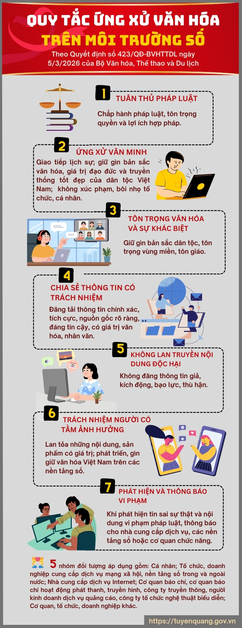 Bộ Văn hóa, Thể thao và Du lịch vừa có Quyết định số 423/QĐ-BVHTTDL ngày 5/3/2026 Ban hành Bộ Quy tắc ứng xử văn hóa trên môi trường số. Mọi cá nhân, tổ chức khi tham gia môi trường số phải tuân thủ pháp luật Việt Nam, tôn trọng quyền và lợi ích hợp pháp của tổ chức, cá nhân khác; đồng thời ứng xử văn minh, lịch sự, giữ gìn bản sắc văn hóa, giá trị đạo đức và truyền thống tốt đẹp của dân tộc.